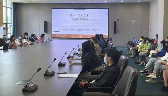 2022年6月9日14:00,买球投注官方网站民族艺术研究院尚美讲堂第十三次学术讲座在图书馆一楼会议室顺利举办。本次讲座邀请了云南大学民族学与社会学学院李世武教授,开展主题为《国外“民族艺术”相关概念辨析》的学术讲座。讲座采取线上线下结合的方式,民研院党总支书记迟燕琼教授主持,硕士生导师雀宁、肖李、和璇老师等以及全体学生参加线下讲座,线上人数接近上百人。讲座伊始,迟燕琼教授介绍了李世武教授的学术经历和研究成果,并感谢李世武教授对民族艺术研究院发展的支持。