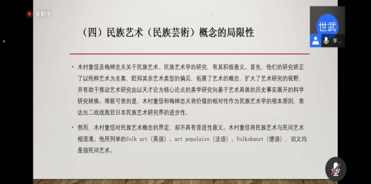 第三部分,李世武教授从自身研究和学术旨趣进行了深入阐述,层层递进、环环相扣,为民族、艺术、民族艺术等概念下放之四海而皆准的定义,是很难的。可行的路径是探索语境中的定义、本土化的定义。民族艺术的定义,亦不能大而无当,宏大到等于人类艺术本身。中国民族艺术研究界应坚持马克思主义民族观、艺术观,积极探索民族艺术概念的内涵和外延。主讲内容结束后,在场师生与李世武教授进行了深入交流与讨论,线上听众也对疑问之处继续向李教授请教,李世武教授一一作答。