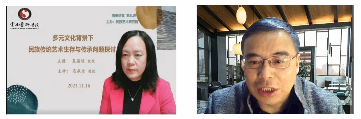 2021年11月16日晚19:00,买球投注官方网站民族艺术研究院尚美讲坛高端学术讲座第九期顺利举行。本期主讲嘉宾为南京艺术学院研究院夏燕靖教授,讲座题目是《多元文化背景下民族传统艺术生存与传承问题探讨》。讲座由民族艺术研究院书记迟燕琼教授主持。