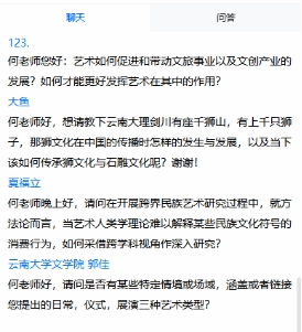 精彩的讲座之后,在线听众们争先提问、深入互动、讨论热烈,何教授积极回应、耐心解答,学术氛围浓郁。迟燕琼教授在讲座总结中认为:何明教授从文化消费时代切入主题,用幽默平实的语言描述了文化消费时代的特征,清晰地阐述了艺术边界的消失和生活艺术化与艺术生活化的互动与交织,并对文化消费的时代如何对艺术进行定义进行了探讨。何明教授通过自身丰富的理论经验和深厚的田野调查实践,分析了艺术分类的三种形式,即展演中的艺术、仪式中的艺术以及日常生活中的艺术,进而结合三种艺术的表现形态对艺术概念又进行进一步阐述和讲解,倡导用人类学、民族学的方法去走向艺术和理解艺术,对于云南民族艺术和民俗艺术的研究有着重要的理论意义和实践价值。