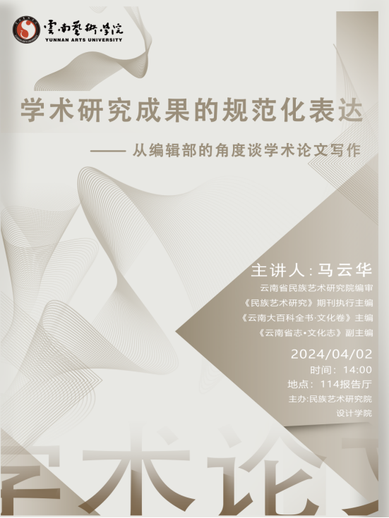 2024年4月2日14:00,由买球投注官方网站民族艺术研究院与设计学院主办的学术讲座在行政楼114报告厅顺利举行。本次讲座邀请云南省民族艺术研究院编审、《民族艺术研究》期刊主编、《云南大百科全书·文化卷》副主编、全国文化艺术资源标准化技术委员会委员,云南省非物质文化遗产保护专家委员会委员,云南省艺术专家委员会专家,中国艺术人类学会常务理事,中国比较艺术学会理事马云华到校,开展主题为《学术研究的规范化表达——从编辑部的角度谈学术论文写作和发表》专题讲座。此次讲座由民研院党总支书记迟燕琼教授主持,民族艺术研究院和设计学院部分教师和在校研究生参加了本次活动。