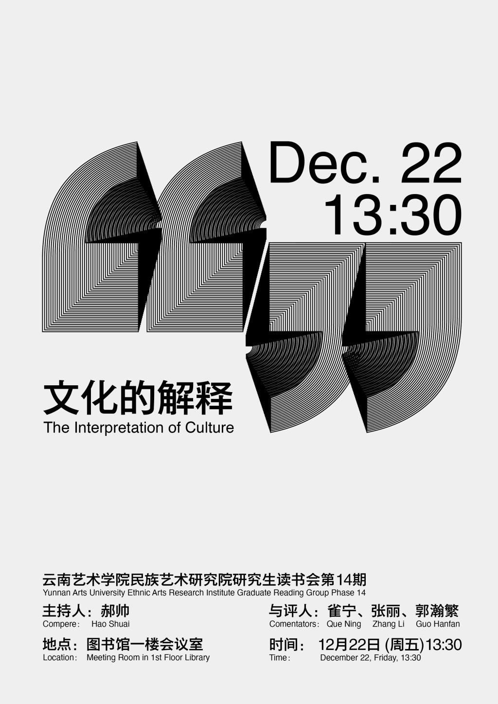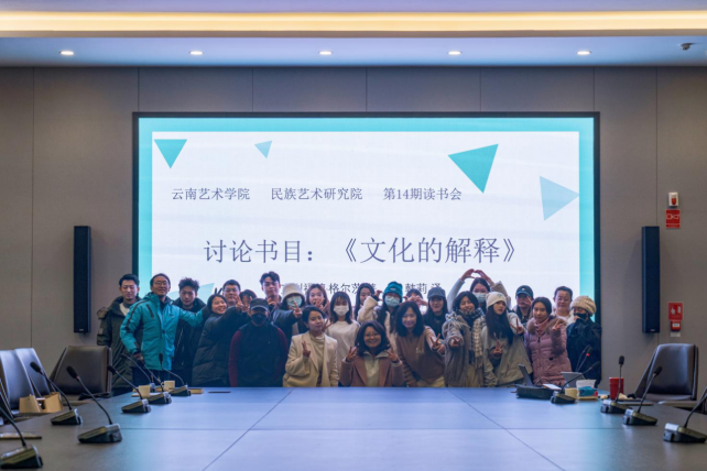 2023年12月22日下午,买球投注官方网站民族艺术研究院第十四期读书会在图书馆会议室举行。本次读书会由郝帅博士主持,围绕克利福德·格尔茨的著作《文化的解释》展开交流和讨论。民族艺术研究院教师郭瀚繁、张丽、雀宁,以及民族艺术研究院2022级、2023级硕士研究生参加。