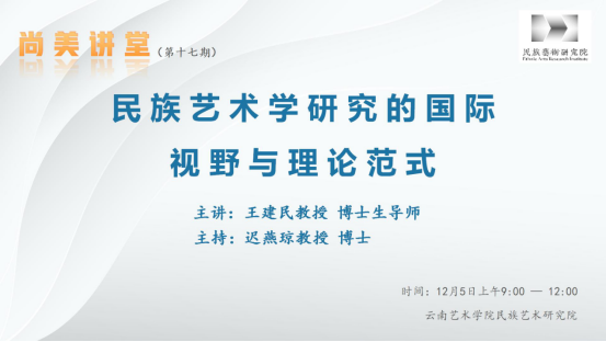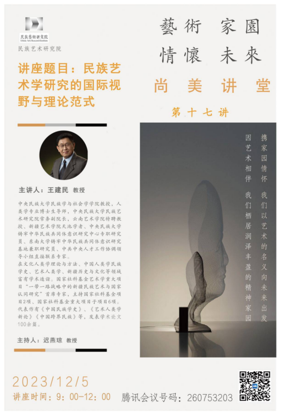 2023年12月5日9:00,民族艺术研究院尚美讲堂系列讲座第十七讲顺利开讲,本次讲座由中央民族大学民族学与社会学学院教授,人类学专业博士生导师,中央民族大学民族艺术研究院常务副院长,买球投注官方网站特聘教授王建民主讲,讲座主题是《民族艺术学研究的国际视野与理论范式》。讲座由民族艺术研究院党总支书记迟燕琼教授主持,民族艺术研究院教师代表及全体研究生参加了此次讲座。