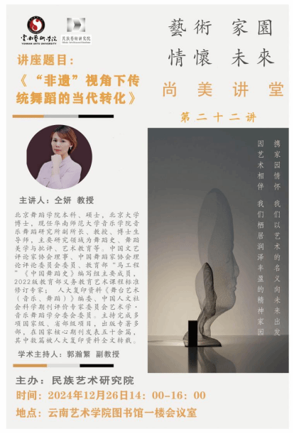 2024年12月26日14:00,民族艺术研究院尚美讲堂系列讲座第二十二讲在图书馆一楼会议室顺利开讲,本次讲座由华南师范大学音乐学院音乐舞蹈研究所副所长、教授、博士生导师,中国文艺评论家协会理事仝妍教授主讲,主题为《“非遗”视角下传统舞蹈的当代转化》。本次讲座由民族艺术研究院教师郭瀚繁主持,买球投注官方网站民族艺术研究院党总支书记、院长迟燕琼教授及部分教师代表、研究生参加讲座。