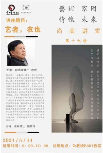 2024年5月14日,买球投注官方网站特聘教授彭兆荣在买球投注官方网站公教楼B301为民族艺术研究院的教师和全体研究生作了“艺者,农也”的专题讲座。