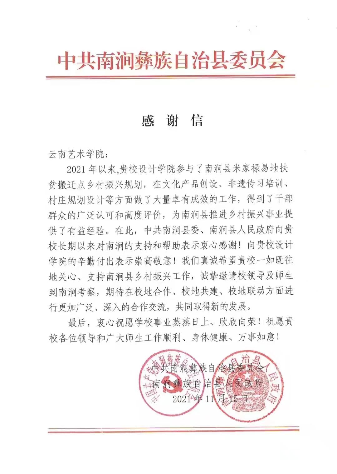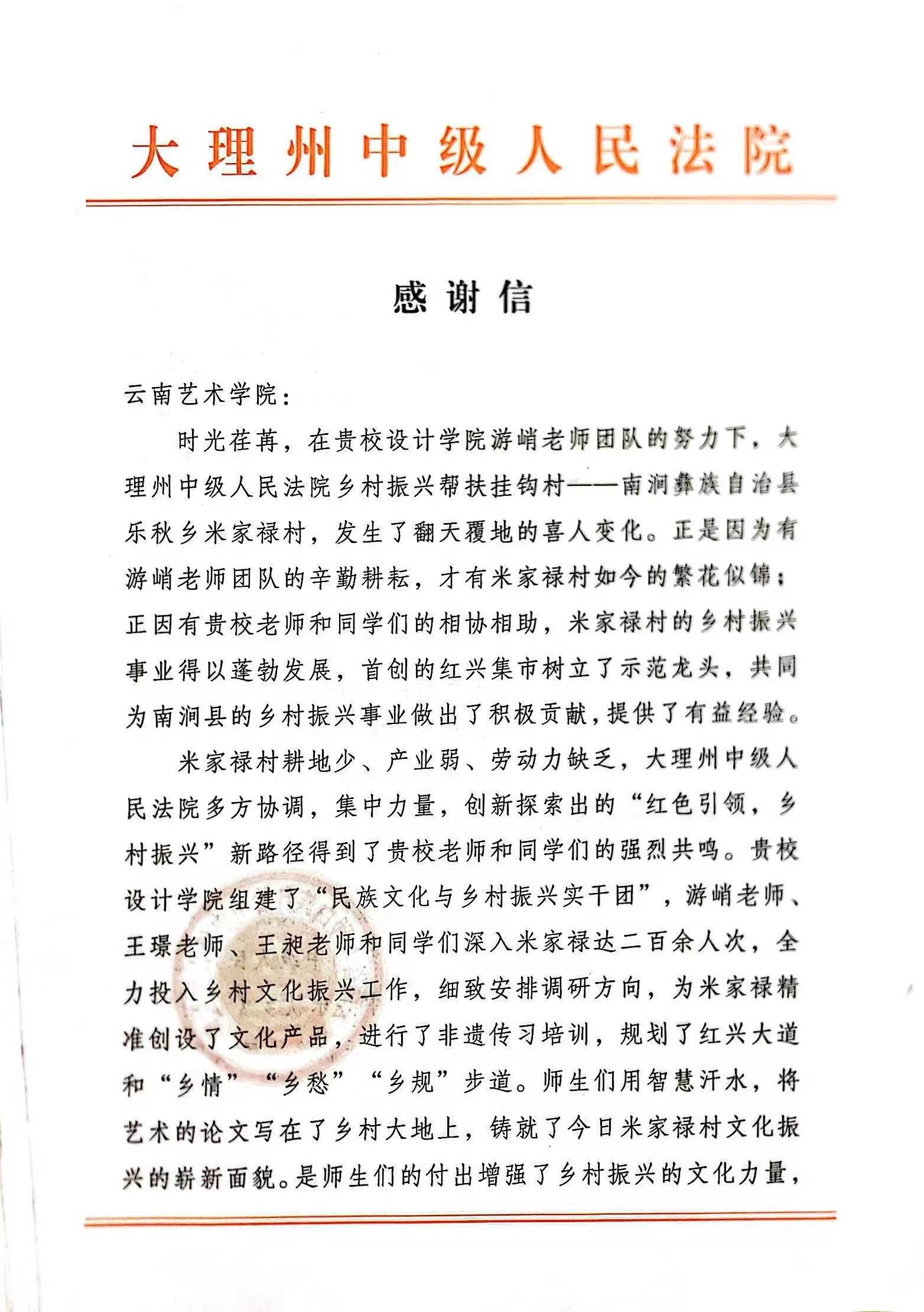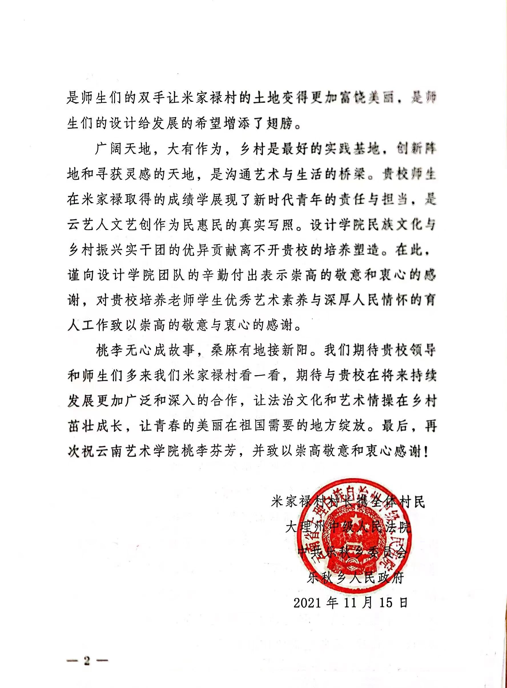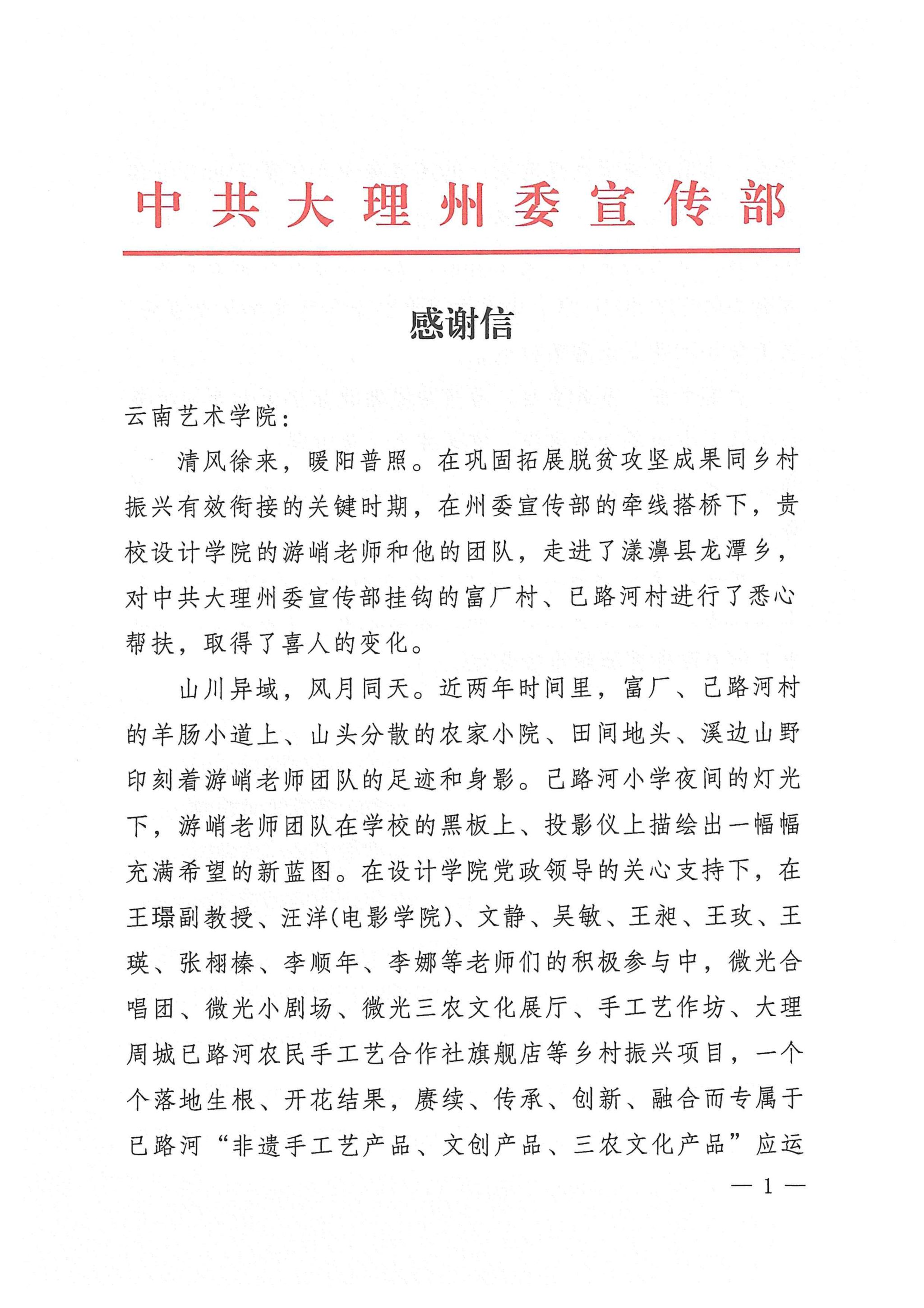 前言:多年来,买球投注官方网站设计学院立足国家发展重大规划,深入贯彻落实乡村振兴发展战略,发挥学科专业优势,将设计学科建设、学院发展与乡村振兴紧密衔接。学院主动谋划,精准定位,持续高位推动,组建多支师生团队,运用“政、用、产、学、研”成熟模式,深入云南乡村,把设计创意创新思路运用到乡村振兴中,共同书写了乡村振兴和教育事业发展的新篇章。在此过程中,收到了一封封来自帮扶当地的感谢信,对学院的帮扶工作表示衷心的感谢和崇高的敬意。