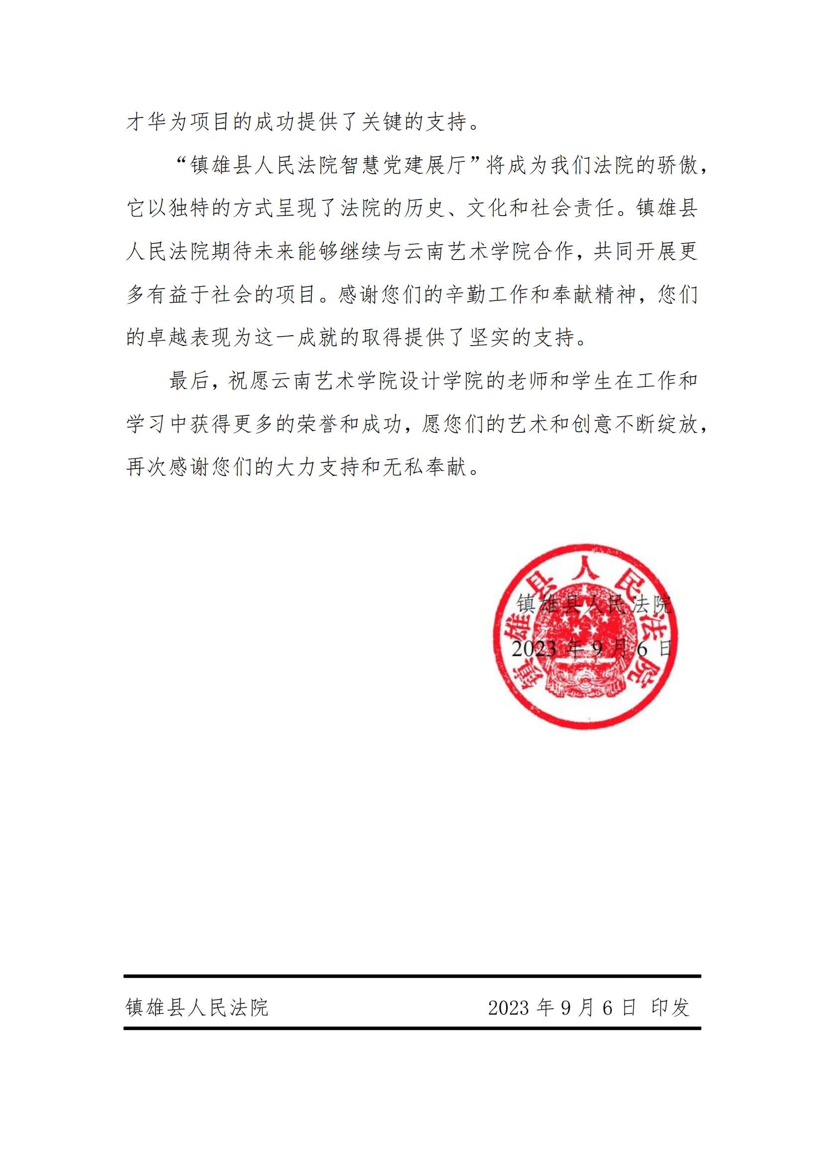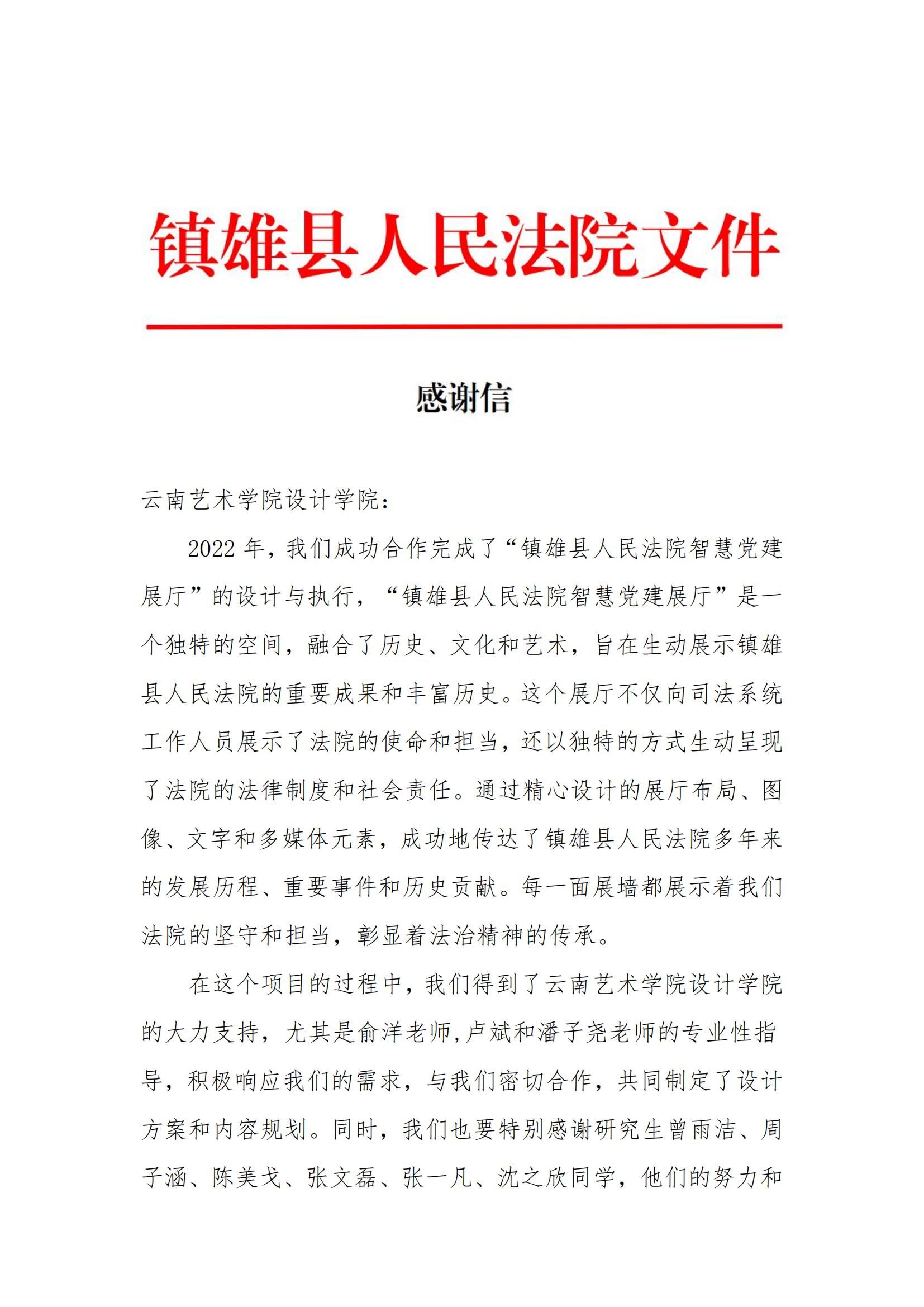 在信息化与智慧化浪潮席卷全球的今天,智慧党建作为新时代党建工作的新引擎,正逐步成为提升党建工作效能、强化党员教育管理的关键力量。买球投注官方网站设计学院积极响应国家智慧党建建设的号召,于2021年启动了与云南镇雄县人民法院的深度合作,旨在通过设计专业的力量,为智慧党建展厅的设计与实施注入新的活力。在此过程中,收到了来自镇雄县人民法院的感谢信,对学院表示衷心的感谢和崇高的敬意。