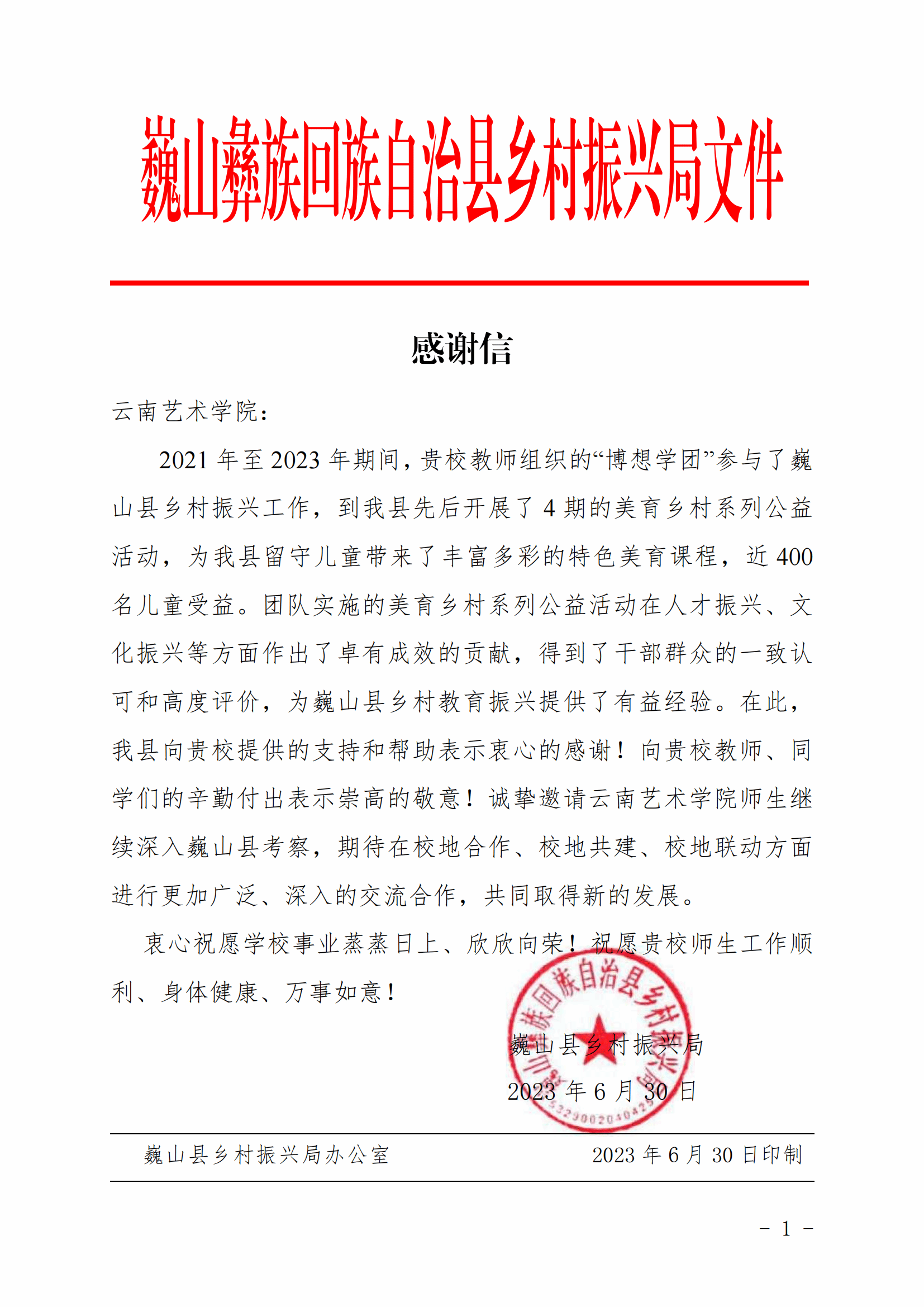 在云岭大地的怀抱中,买球投注官方网站设计学院始终秉持着“艺术服务社会,设计点亮生活”的初心,致力于将美育教育与乡村振兴的宏伟蓝图紧密相连。2021年,由买球投注官方网站设计学院产品设计系发起买球投注官方网站产品设计专业“博想学团”美育乡村系列公益活动。多年来,“博想学团”不仅扎根于云岭的深厚文化底蕴之中,更将这份文化精髓与现代设计理念相融合,为乡村的孩子们带来了前所未有的美育体验,用知识的光芒照亮孩子们的梦想之路,共同绘就乡村美育的新篇章。在此过程中,收到了来自大理州巍山彝族回族自治县乡村振兴局的感谢信,对学院表示衷心的感谢和崇高的敬意。