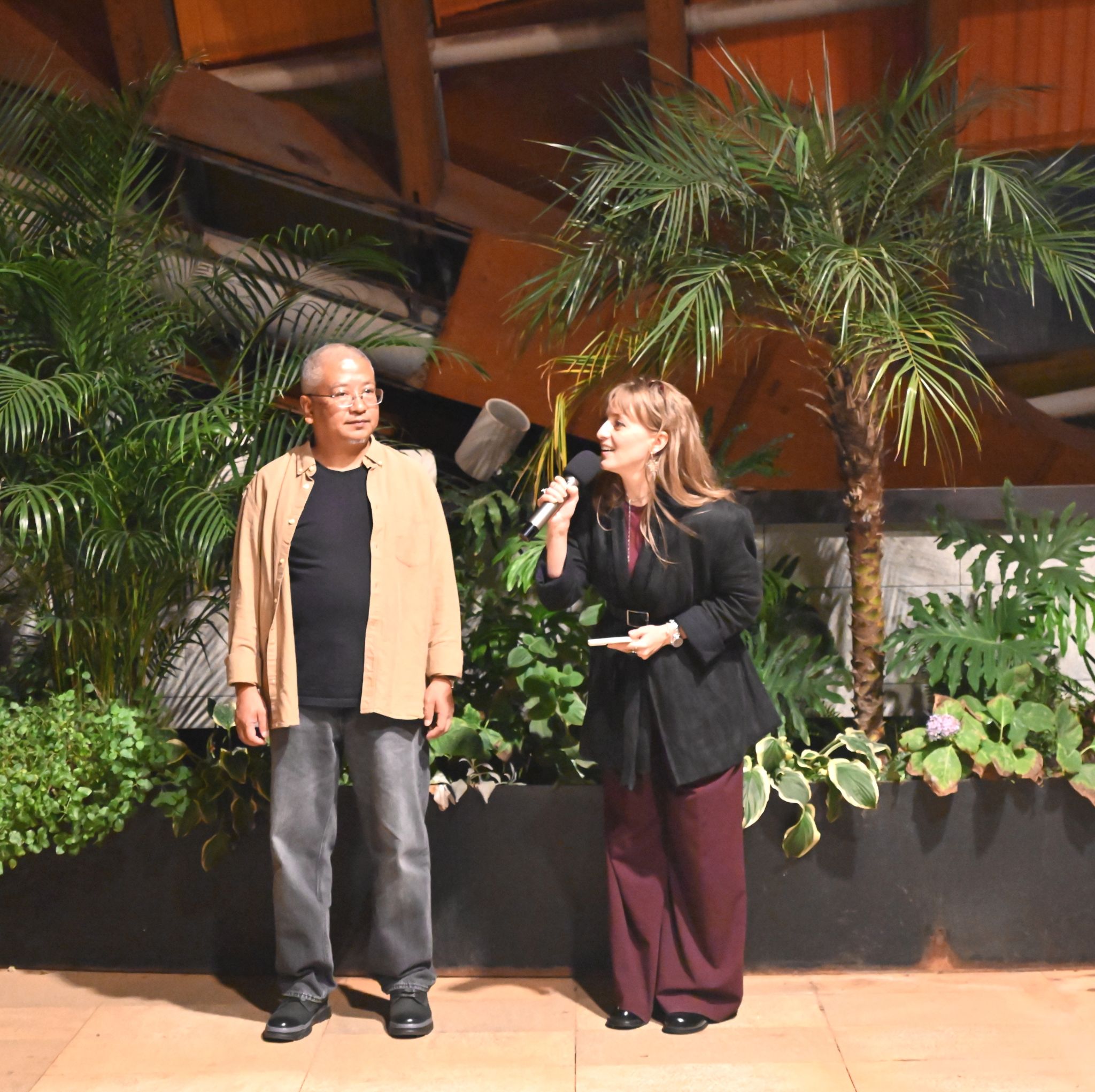 展览于19时30分正式启幕。现场作品以极为简约的线条与抽象的墨痕为起点,逐步延展为树与石的意象,最终融汇为具有强烈个人风格与东方哲思的完整景观。观众穿行其中,所感受到的并非主题的切换,而是一种如自然生长般的时间节奏与内在韵律——恰如“石入墨”这一题旨所喻,物质与笔墨在时间中彼此渗透、相互成就。