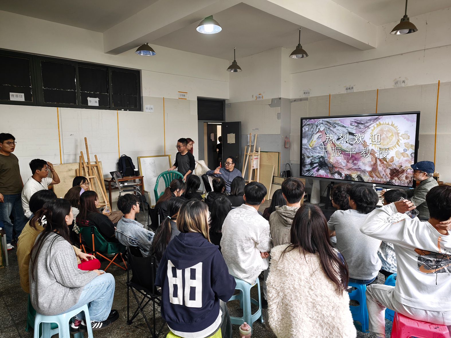 美术学院一百余名师生参与开班仪式和讲座。于振平教授围绕当代水性材料的艺术语言展开分享,结合中西方艺术交融背景,解析材料创新与思想表达的内在关联,并现场示范水性材料的技法运用,直观展现其丰富表现力。从理论解析到实践演示,内容兼具学术深度与实用价值,为绘画专业学子搭建了深入学习的平台。