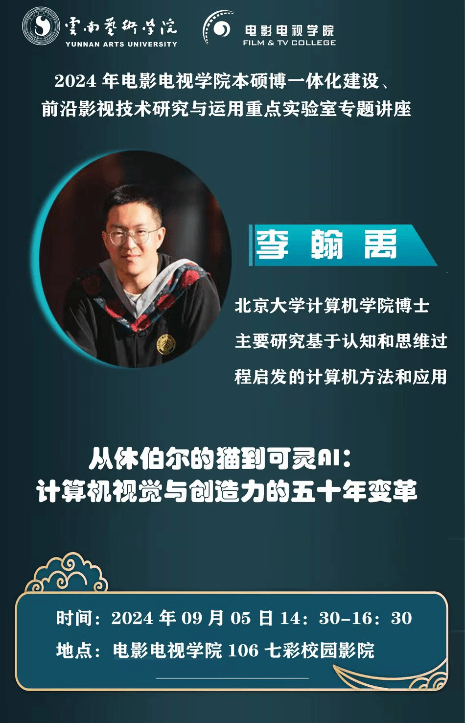 2024年9月5日下午,买球投注官方网站云南省高校前沿影视技术研究与运用重点实验室邀请北京大学计算机学院的博士生李翰禹开展讲座。主题内容为:“从休伯尔的猫到可灵AI:计算机视觉与创造力的五十年变革”。此次讲座为2024 年电影电视学院本硕博一体化建设、前沿影视技术研究与运用重点实验室专题讲座。电影电视学院副院长、实验室负责人谢波主持讲座。