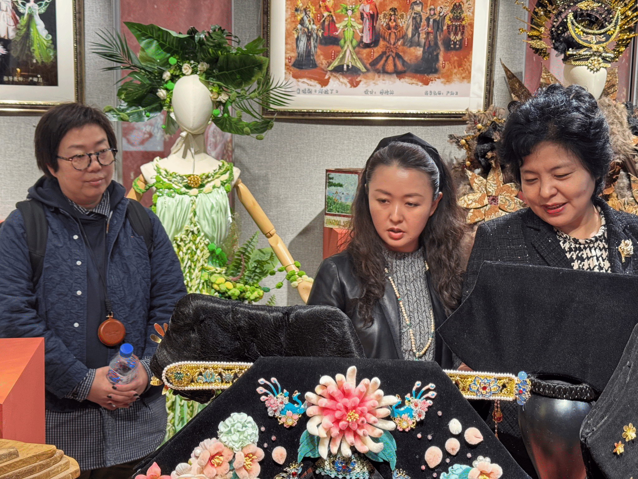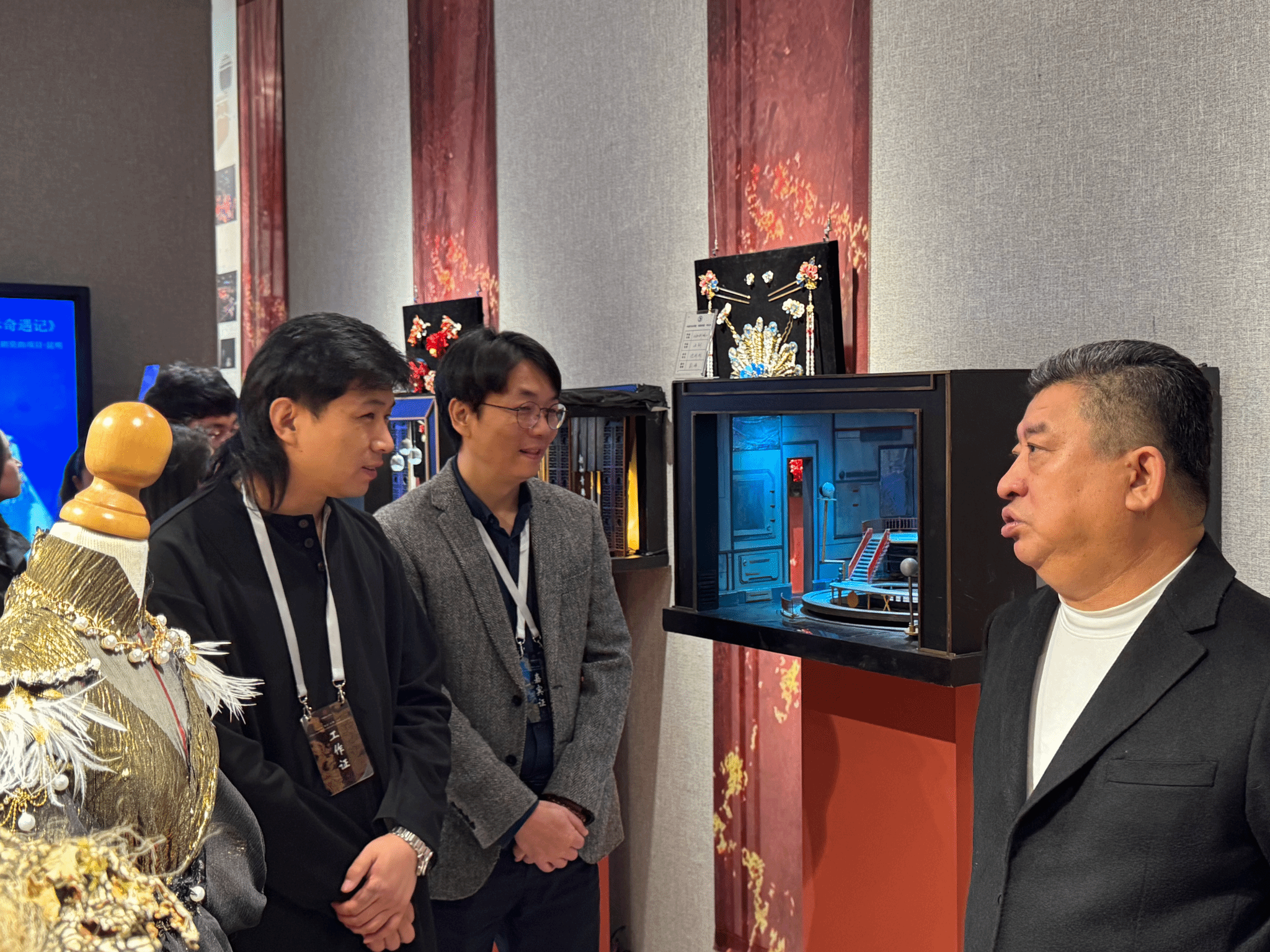 中国舞台美术学会副会长马路教授(右一)、吉林艺术学院党委书记张东航(中)观看展览