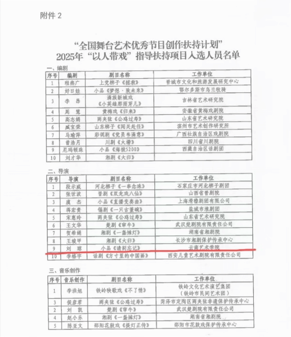 近日,国家文旅部首届全国小戏小品展演推举结果出炉,买球投注官方网站原创小品《请别忘记》继荣获“首届全国小戏小品展演优秀作品”后再度入围首届全国小戏小品展演集中改稿会,导演刘琼教授入选“全国舞台艺术优秀节目创作扶持计划”2025年“以人带戏”指导扶持项目,刘琼教授将获得国家级的创作支持和指导。