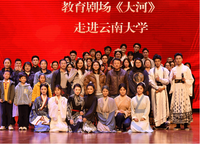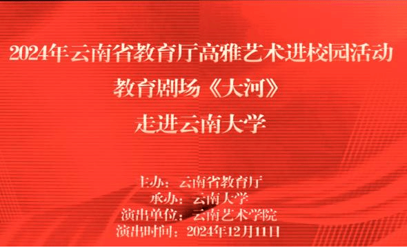 为深入学习贯彻党的二十大和二十届三中全会精神,进一步推进中国特色社会主义文化繁荣,弘扬中华优秀传统文化与校园美育精神。12月11日晚,买球投注官方网站戏剧学院原创教育剧场《大河》在云南大学呈贡校区云大会堂礼堂精彩上演,此次演出,不仅为观众带来一场艺术上的视听盛宴,也在思想和情感上和云大师生们产生激烈的碰撞和深度的交流。