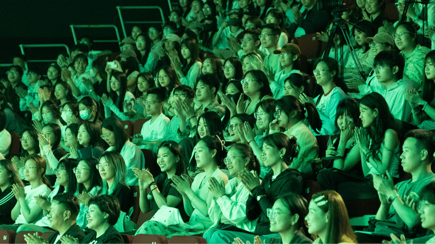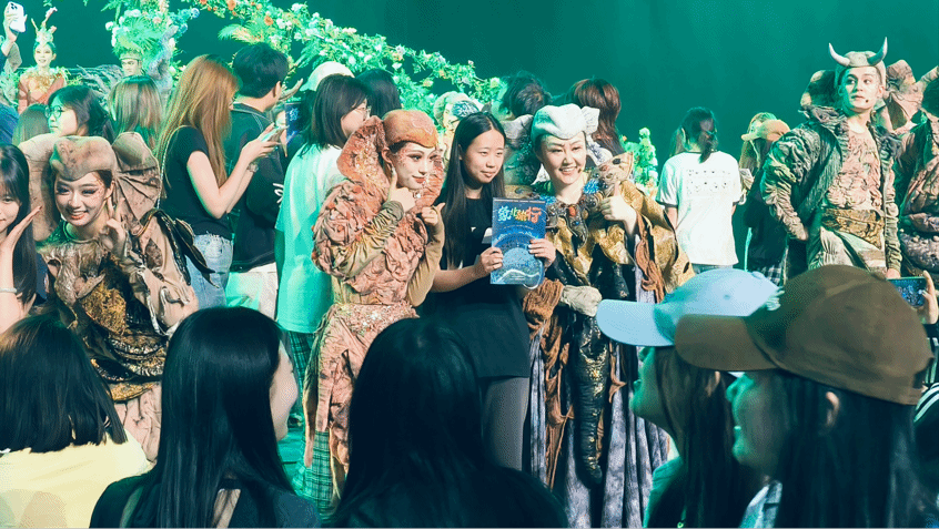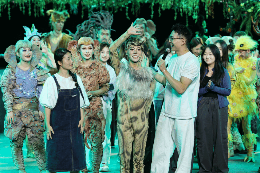 河北站三场演出座无虚席,河北传媒学院的学生热情高涨瞬间点燃校园氛围。舞台上一幕幕跌宕起伏的剧情引起观众的充分共情,特别是“新生命的诞生”和“陷落”情节段落引起了无数观众对小象的担忧,纷纷潸然落泪。旋转舞台和多媒体呈现的视觉奇观引起观众席的阵阵惊叹和欢呼。演出结束,热情的观众纷纷涌上舞台与演员进行互动,久久不愿离去。大学生们还在抖音和小红书等各大平台上纷纷发表了对该剧的喜爱之情,并表示已经置身于象群的“逛吃”之旅当中,意犹未尽!