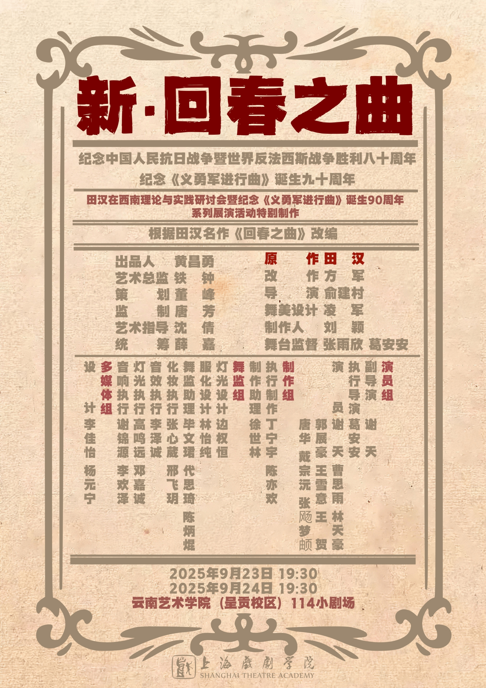 为纪念中国人民抗日战争暨世界反法西斯战争胜利80周年、《义勇军进行曲》诞生90周年,上海戏剧学院演出的话剧《新·回春之曲》,于2025年9月23、24日,在由买球投注官方网站与田汉基金会主办的“田汉在西南理论与实践研讨会暨纪念《义勇军进行曲》诞生90周年系列展演活动”上精彩上演。演出搭建起了沪滇艺术高校交流的桥梁,更体现了青年学子以戏剧之力对红色记忆的传承。