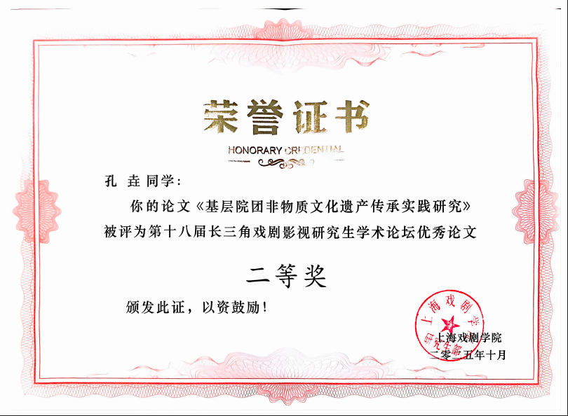 2025年10月中旬,由上海戏剧学院主办的第十八届长三角戏剧影视研究生学术论坛“中国传统戏剧美学精神的现代转化”成功举办。论坛共收到了来自全国各地40余所高校的在读博士生、硕士生投稿105篇。经过各位专家的评审和推荐,共有3名博士研究生获得了优秀论文一等奖,3名硕士研究生获得优秀论文二等奖。戏剧学院2024级中外戏剧史论专业硕士研究生孔垚的论文《基层院团非物质文化遗产传承实践研究》荣获优秀论文二等奖,成为3位荣获奖项的硕士研究生之一。