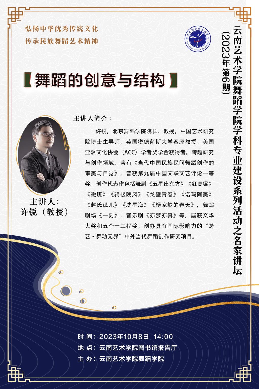 为进一步推动舞蹈学院学科专业建设,拓展师生舞蹈创作思维,提高舞蹈学院创作水平,舞蹈学院于10月08日举办了2023年第6期学科专业建设系列活动之“名家讲坛”。本次活动特邀北京舞蹈学院院长、教授,中国艺术研究院博士生导师,英国密德萨斯大学客座教授,美国亚洲文化协会(ACC)学者奖学金获得者许锐教授作题为《舞蹈的创意与结构》的专题讲座。讲座由买球投注官方网站党委副书记、院长欧阳俊虎主持,舞蹈学院师生参加。