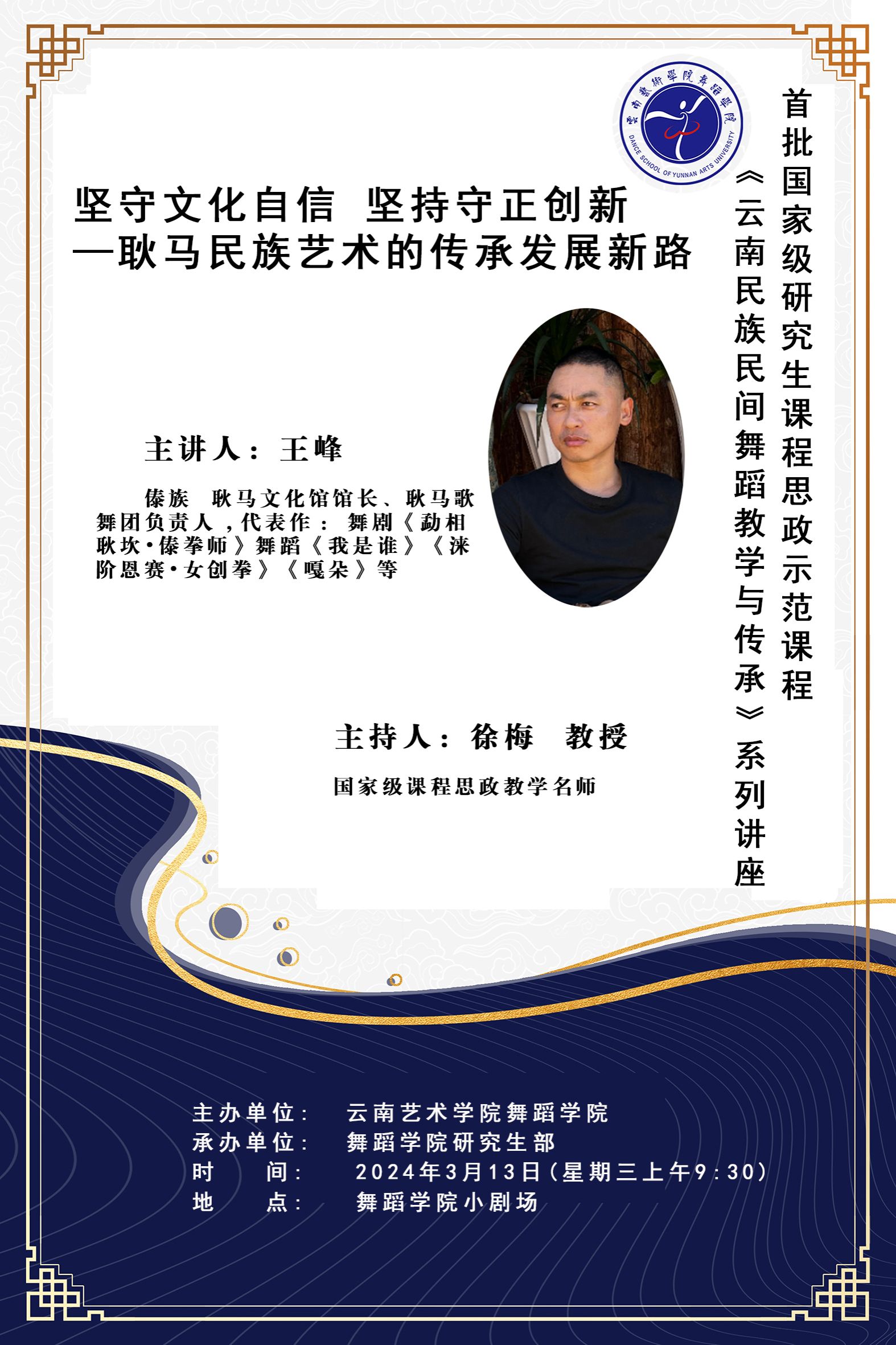 3月13日,买球投注官方网站舞蹈学院举办首批国家级研究生课程思政示范课程《云南民族民间舞蹈教学与传承》系列讲座,邀请了耿马县文化馆馆长、耿马县歌舞团负责人、云南省“兴滇英才支持计划”文体人才王峰到舞蹈学院开展题为《坚守文化自信 坚持守正创新——耿马民族艺术的传承发展新路》的讲座。讲座由国家级课程思政教学名师徐梅教授主持,舞蹈学院各系教师代表及研究生、本科生参加。