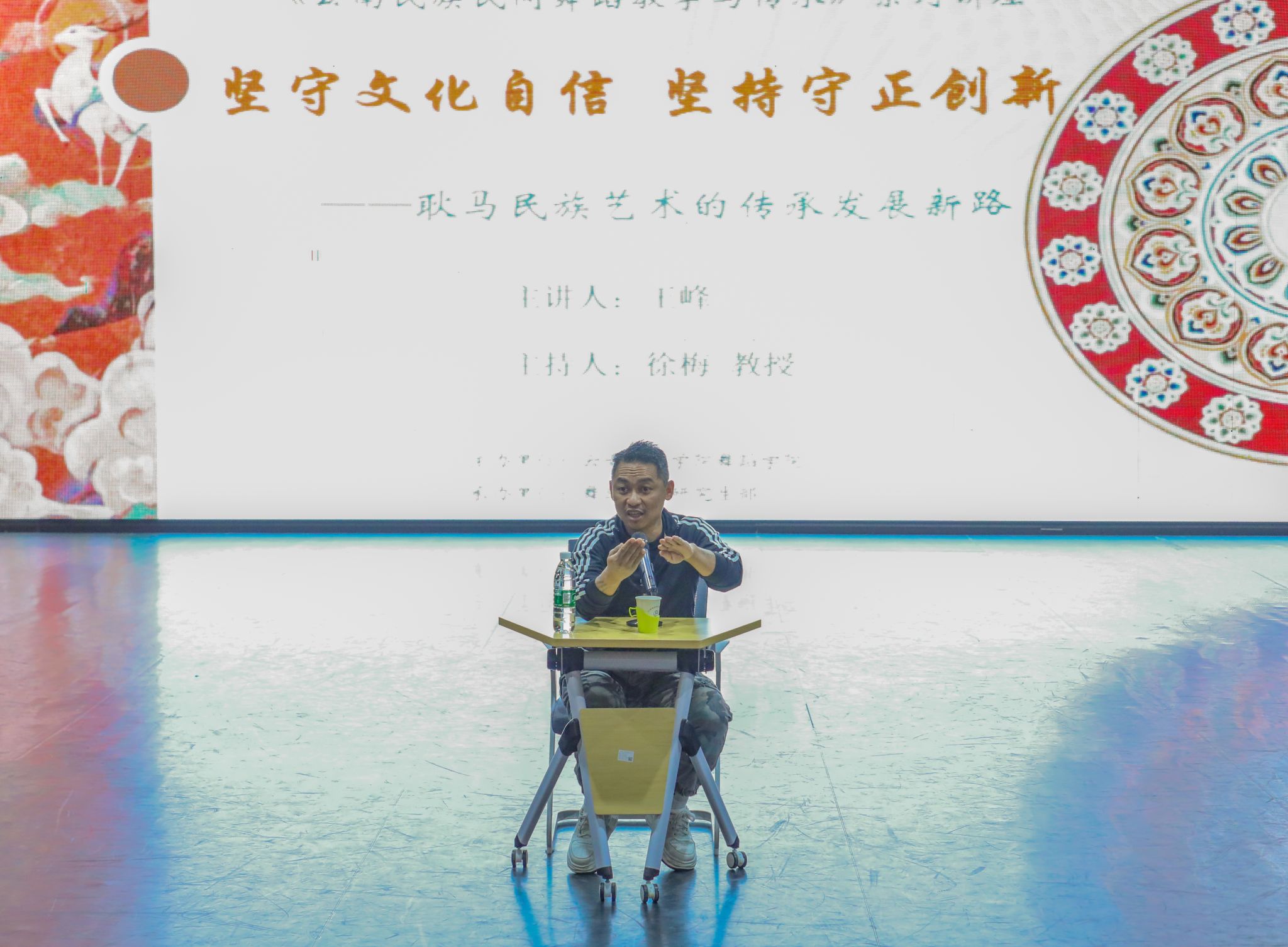 主讲人王峰以回顾个人经历开篇,讲述了自身与耿马县歌舞团的故事,特别回顾了针对濒危非遗项目开展抢救性记录而主动深入非遗项目所在地区探寻村寨并访谈传承人的亲身经历,深入剖析了耿马县歌舞团在多年的实践中如何破题民族艺术传承的困境问题,并以耿马县歌舞团近年来的舞台艺术创作产出与新媒体结合推出的网红作品为例,为现场师生们生动呈现了传统文化的创新表达。
