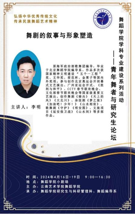 为全面提升人才培养质量,舞蹈学院以本科教育教学审核评估为契机,以评促建、以评促改、以评促管、以评促强,于2024年4月16日—4月19日举办了2024年学科专业建设系列活动之“青年舞者与研究生论坛——舞剧的叙事与形象塑造”。本次活动特邀原海军政治部歌舞团国家二级编导李明担任主讲专家,开展了为期4天的现场教学。本次活动由舞蹈学院研究生和科研管理科、舞蹈编导系承办,舞蹈学院院长刘丽教授主持,部分舞蹈编导专业本科生和舞蹈编导方向研究生参加学习。
