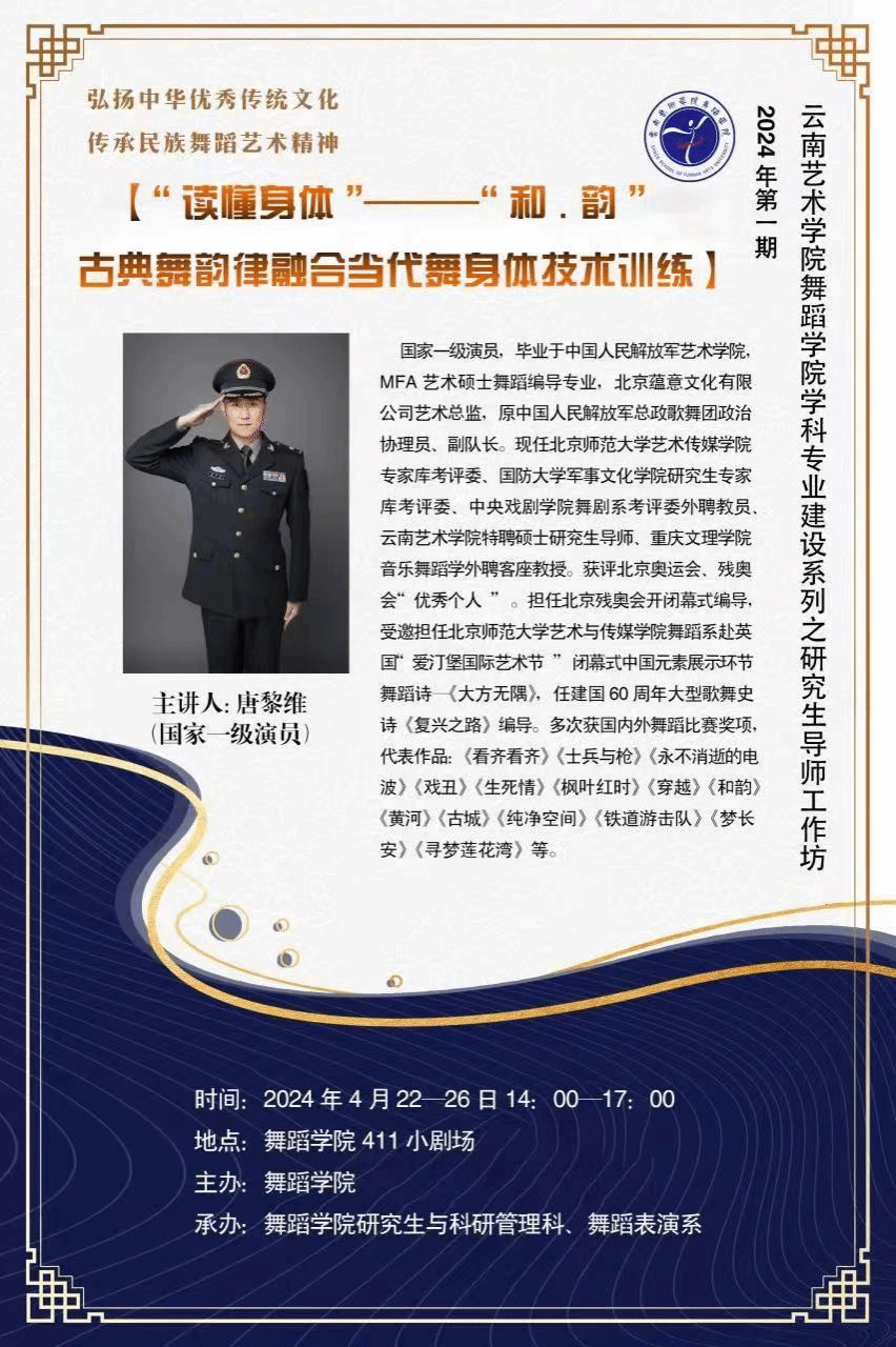 为全面提升卓越人才培养能力,多举措服务学生成才,舞蹈学院以本科教育教学审核评估为动力,以评促建、以评促改、以评促管、以评促强,于 4月22日—26日举办了2024年第1期学科专业建设系列活动之研究生导师工作坊“‘读懂身体’——‘和·韵’古典舞韵律融合当代舞身体技术训练”。本次工作坊的授课导师是原中国人民解放军总政歌舞团政治协理员、副队长,北京蕴意文化有限公司艺术总监,买球投注官方网站硕士研究生导师,国家一级演员,优秀青年舞蹈家唐黎维老师。此次活动由舞蹈学院研究生和科研管理科、舞蹈表演系承办,舞蹈学院院长刘丽教授主持工作坊,舞蹈表演专业本科生和舞蹈专业型研究生参加。