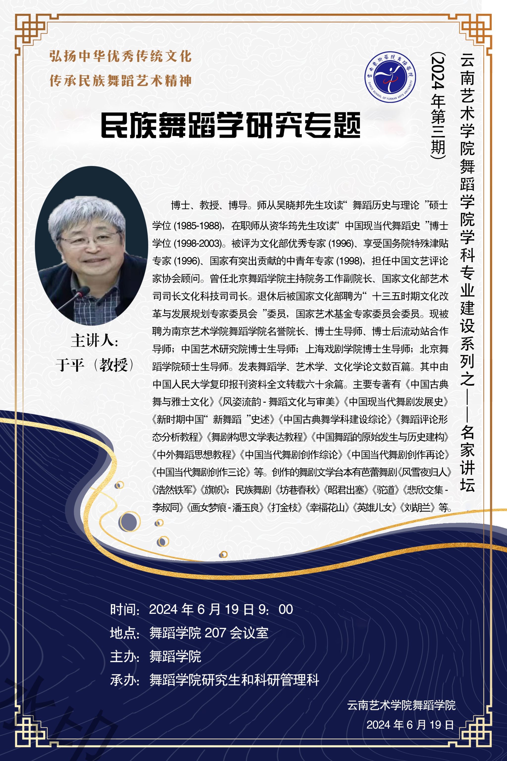为进一步推动舞蹈学院学科体系和专业建设,提升学生专业能力水平,拓宽学术视野,增强创新意识,舞蹈学院学科专业建设系列之名家讲坛第三期于2024年6月19日在舞蹈学院207会议室举行。此次讲座特邀文化部优秀专家、享受国务院特殊津贴专家、国家有突出贡献的中青年专家,中国文艺评论家协会顾问,原国家文化部艺术司司长、文化科技司司长,南京艺术学院舞蹈学院名誉院长、博士生导师、博士后流动站合作导师于平教授担任主讲嘉宾,面向舞蹈学院研究生导师和全体研究生开设题为《民族舞蹈学研究》的学术讲座。本次讲座由舞蹈学院院长刘丽教授主持。
