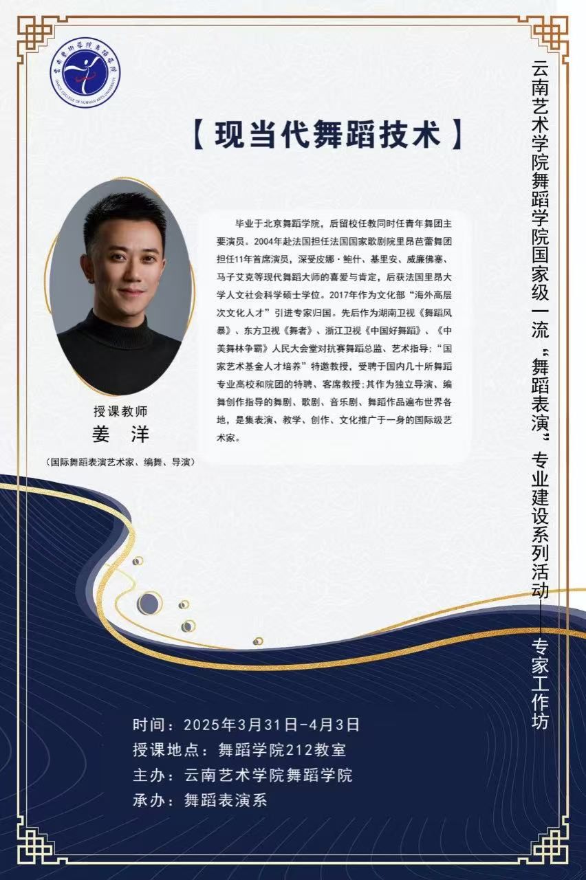 2025年3月31日至4月3日,买球投注官方网站舞蹈学院举办国家级一流“舞蹈表演”专业建设系列活动之“专家工作坊”。本次活动特邀国际舞蹈表演艺术家、编舞、导演姜洋担任主讲教师,开展为期4天的“现当代舞蹈技术”的现场教学。本次活动由舞蹈表演系承办,舞蹈表演专业30名本科生参加学习。